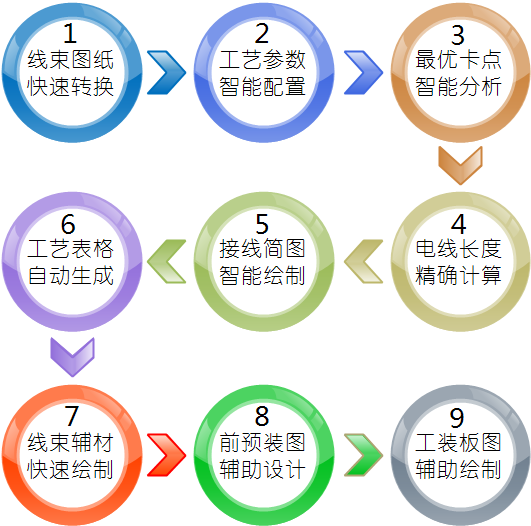 CAPP模塊可自動為電線兩端匹配端子、剝頭長度、壓接檢驗標準、防水栓和裁線余量等工藝技術參數;可自動提醒待短接線號,智能分析各回路線號的最優短接位置,最大程度降低電線成本,可快速計算各線號裁線長度,一鍵繪制短接簡圖,快速生成工藝下線表、周轉卡、下管BOM、物料BOM等工藝數據。同時還提供線束包扎及定位裝置的快速繪制及統計分析,前預裝圖快速輔助設計,工裝板圖輔助繪制等功能。通過軟件可確保工藝結果的正確性,提高工作效率5倍左右,降低新進工程師的工藝學習難度。